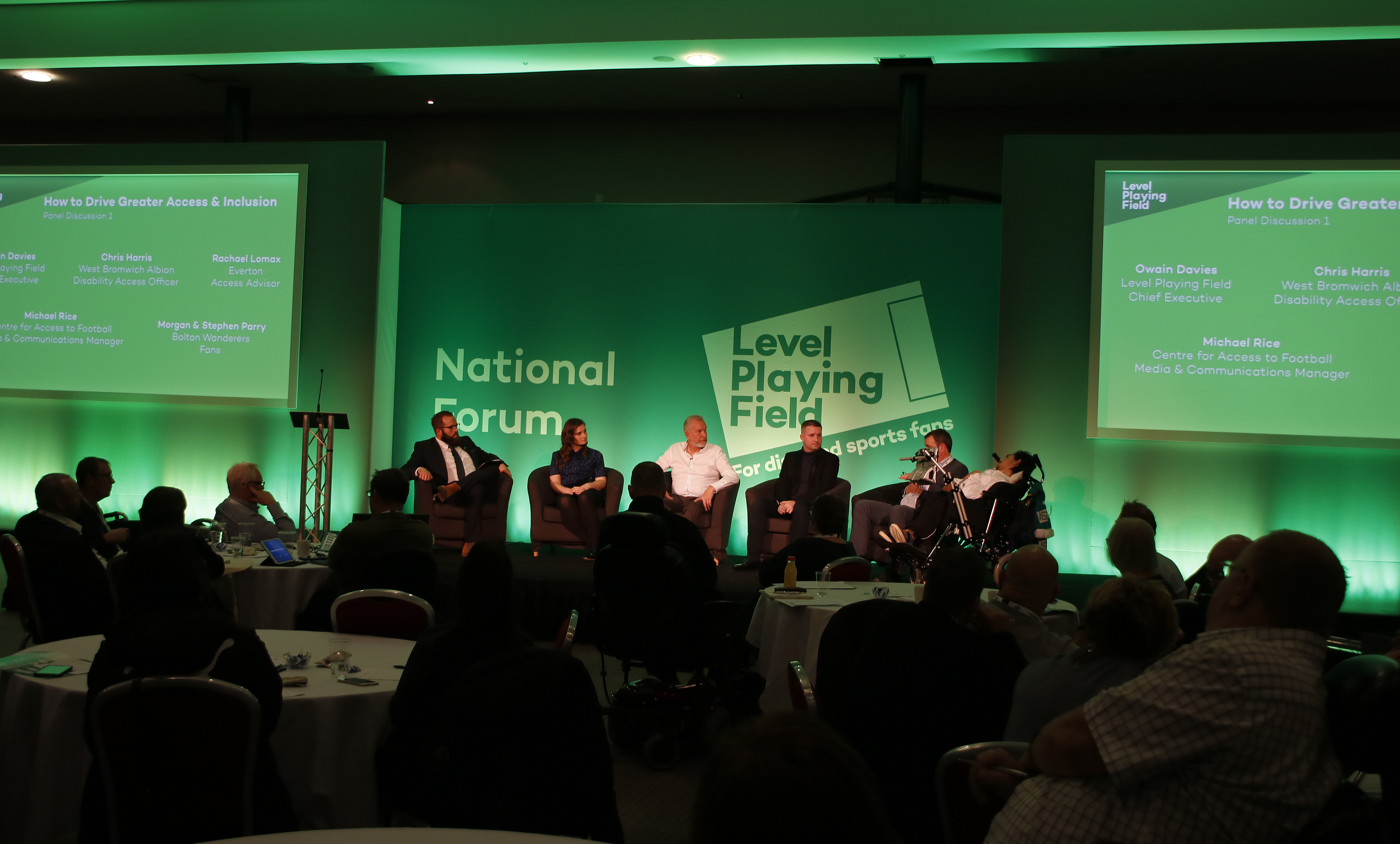 After brief introductions from Owain, Chair Tony Taylor and Vice President Lord Richard Rosser, the forum kicked off with a Panel Q&A titled, ‘How to Drive Greater Access and Inclusion’. Invited up to join Owain on stage was West Bromwich Albion Disability Access Officer, Chris Harris, joined by Rachael Lomax, Access Adviser at Everton, Michael Rice who manages Media and Communications at our sister organisation CAFÉ (Centre of Access to Football in Europe) and Level Playing Field ambassador Morgan Parry, accompanied by his father Stephen Parry, Bolton Wanderers season ticket holders.